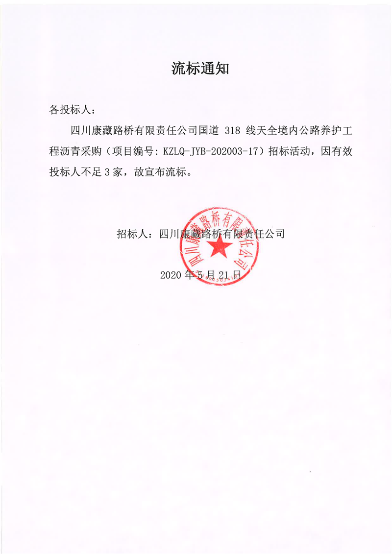 四川康藏路橋有限責(zé)任公司國道318線天全境內(nèi)公路養(yǎng)護(hù)工程瀝青采購項目流標(biāo)通知