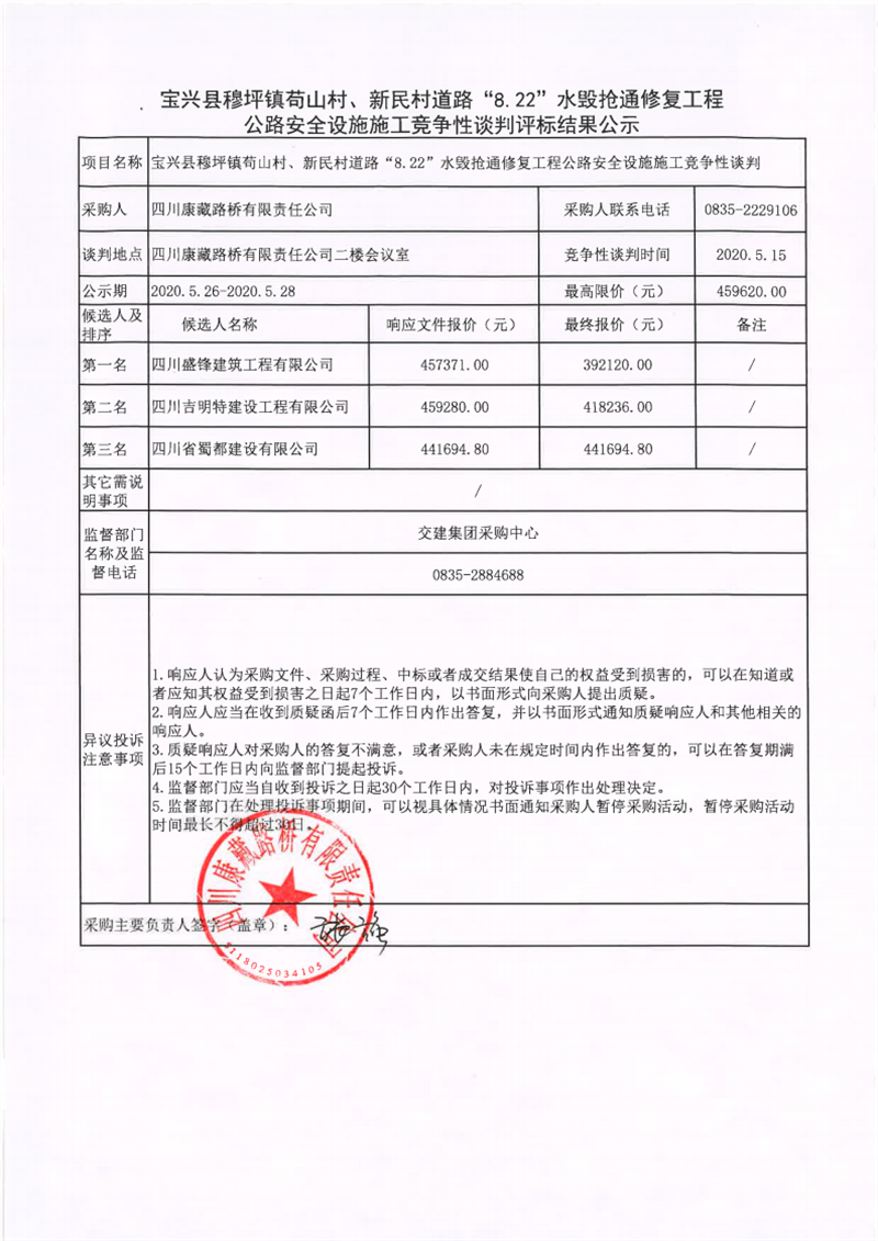 四川康藏路橋有限責任公司寶興縣穆坪鎮(zhèn)茍山村、新民村道路“8.22”水毀搶通修復工程公路安全設施施工競爭性談判評標結果公示