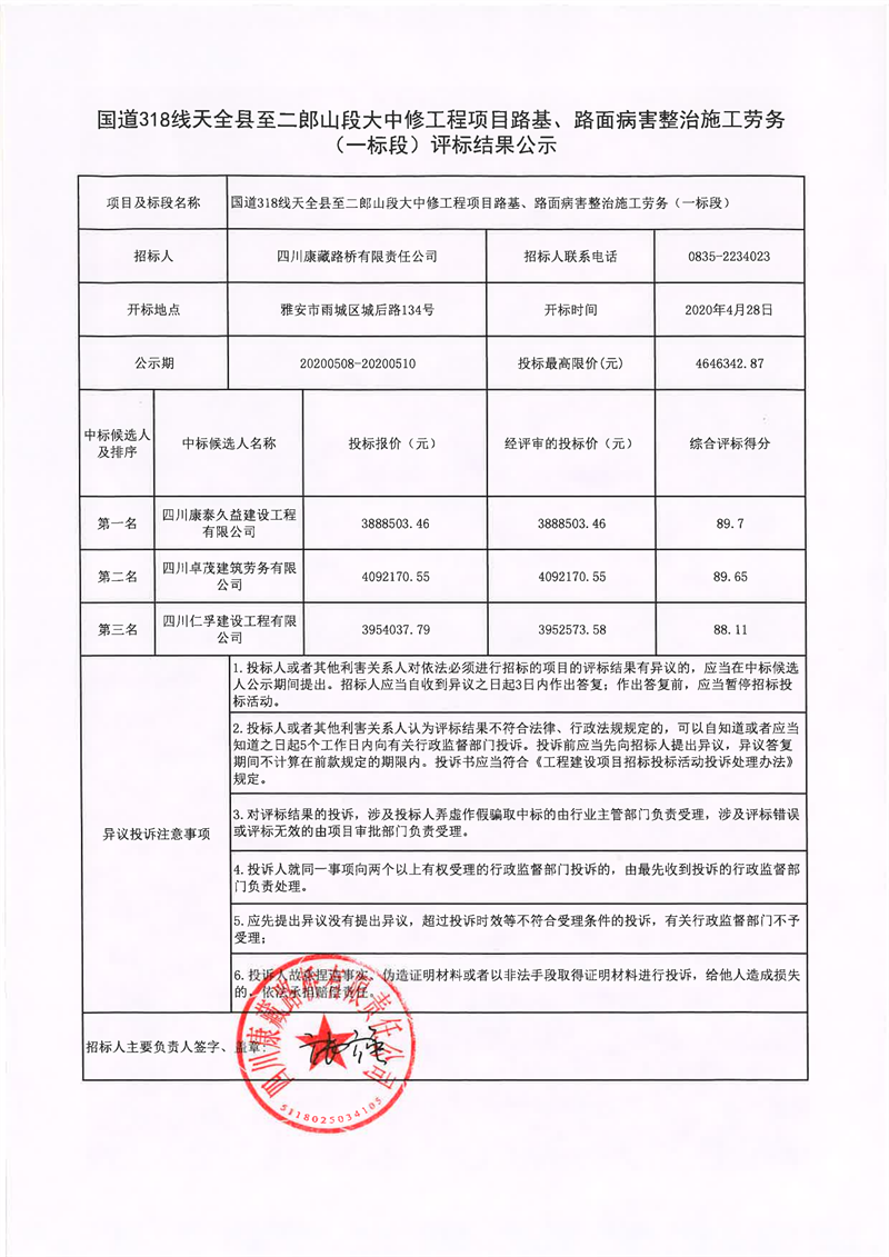 四川康藏路橋有限責(zé)任公司國道318線天全縣至二郎山段大中修工程項目路基、路面病害整治施工勞務(wù)(一標(biāo)段)評標(biāo)結(jié)果公示