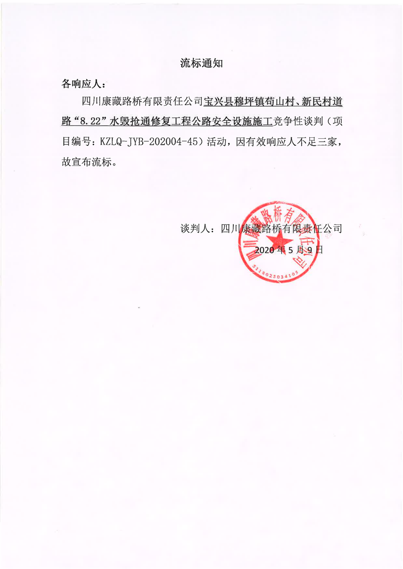 四川康藏路橋有限責(zé)任公司寶興縣穆坪鎮(zhèn)茍山村、新民村道路“8.22”水毀搶通修復(fù)工程公路安全設(shè)施施工競爭性談判流標(biāo)通知