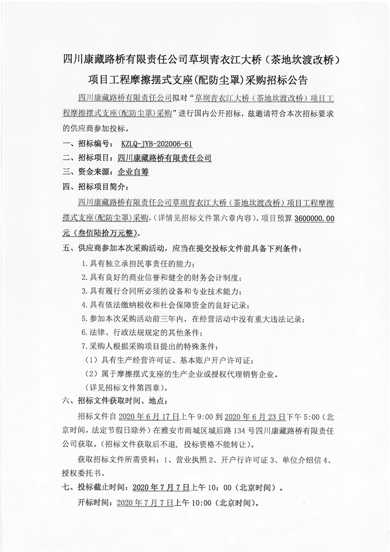 四川康藏路橋有限責(zé)任公司草壩青衣江大橋(茶地坎渡改橋)項(xiàng)目工程摩擦擺式支座(配防塵罩)采購(gòu)招標(biāo)公告
