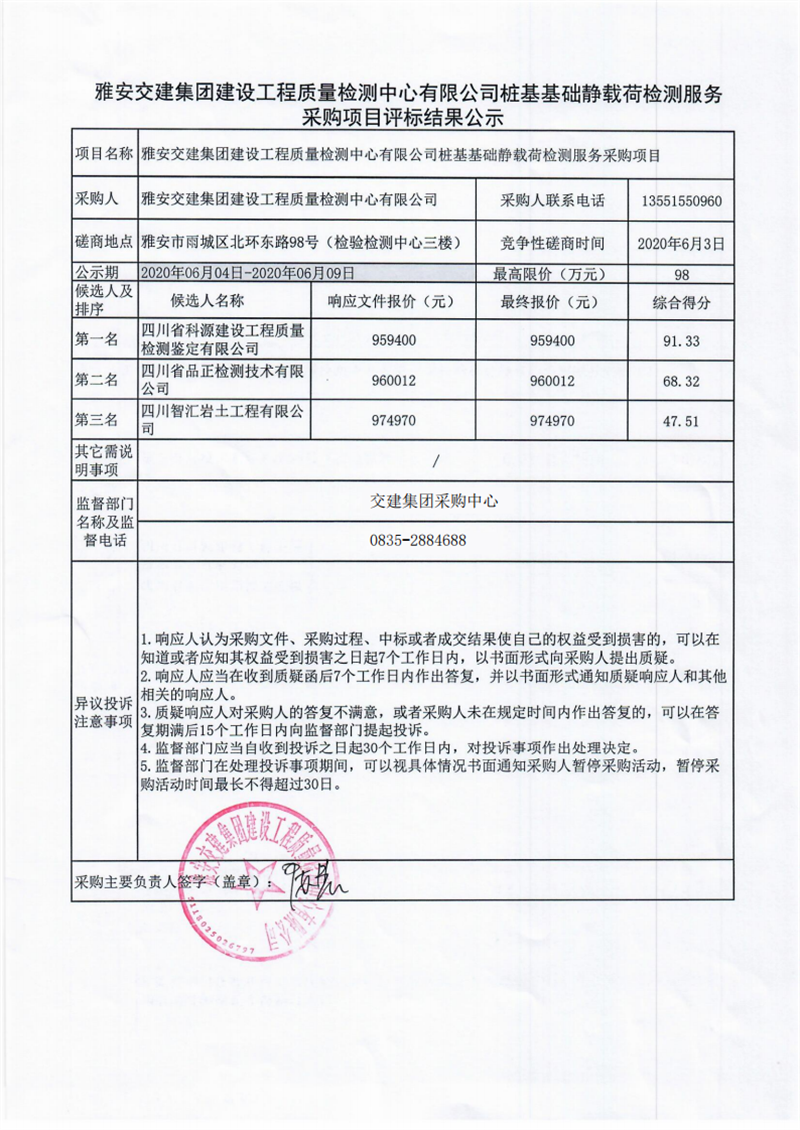 雅安交建集團建設(shè)工程質(zhì)量檢測中心有限公司樁基基礎(chǔ)靜載荷檢測服務(wù)采購項目評標(biāo)結(jié)果公示