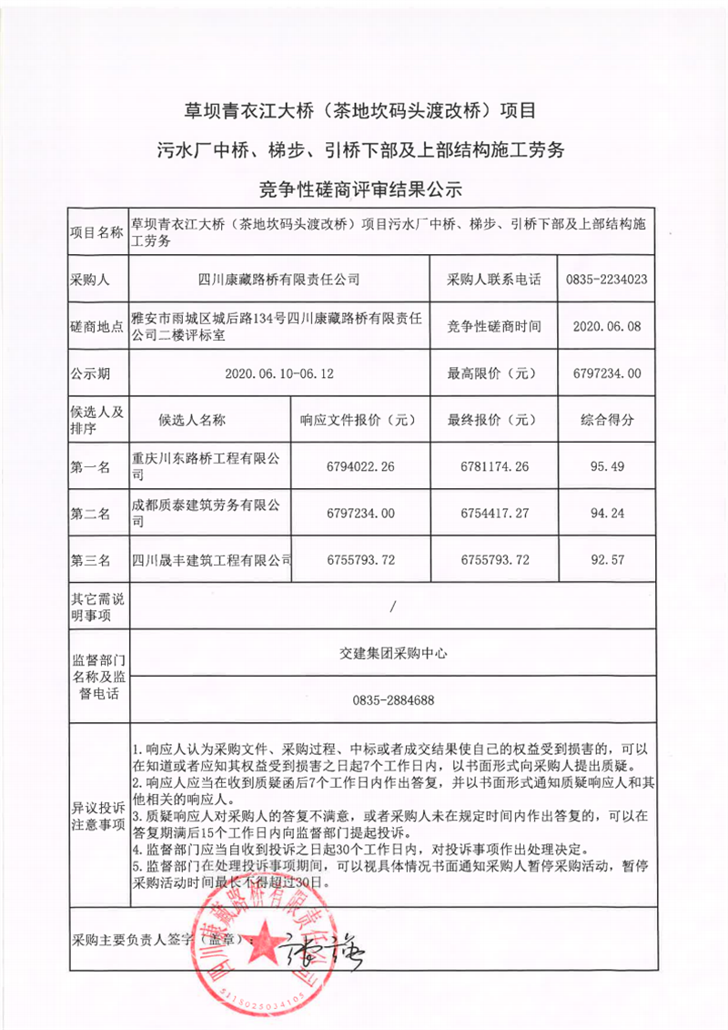四川康藏路橋有限責(zé)任公司草壩青衣江大橋(茶地坎碼頭渡改橋)項(xiàng)目污水廠中橋、梯步、引橋下部及上部結(jié)構(gòu)施工勞務(wù)競爭性磋商評(píng)審結(jié)果公示