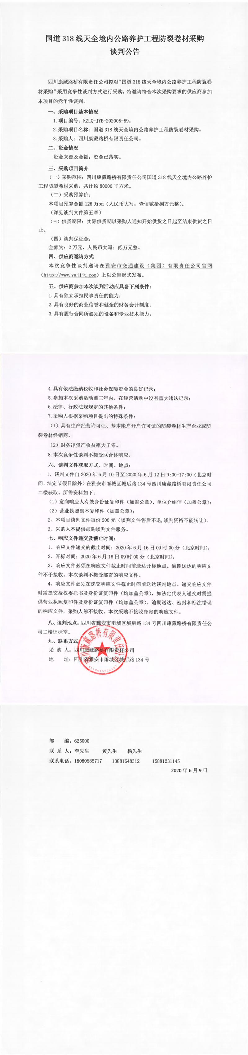 四川康藏路橋有限責(zé)任公司國(guó)道318線(xiàn)天全境內(nèi)公路養(yǎng)護(hù)工程防裂卷材采購(gòu)競(jìng)爭(zhēng)性談判公告