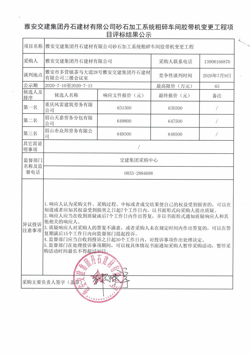 雅安交建集團(tuán)丹石建材有限公司砂石加工系統(tǒng)粗碎車(chē)間膠帶機(jī)變更工程項(xiàng)目評(píng)標(biāo)結(jié)果公示