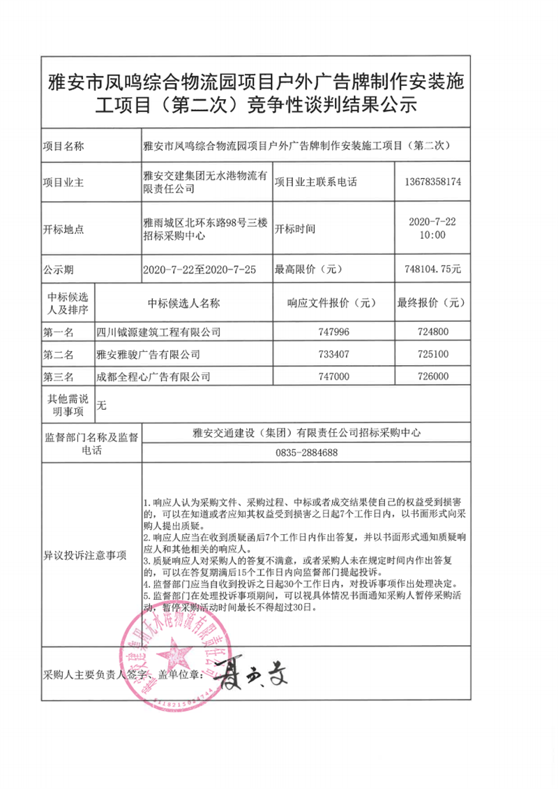雅安交建集團(tuán)無(wú)水港物流有限責(zé)任公司雅安市鳳鳴綜合物流園項(xiàng)目戶(hù)外廣告牌制作安裝施工項(xiàng)目(第二次)競(jìng)爭(zhēng)性談判結(jié)果公示