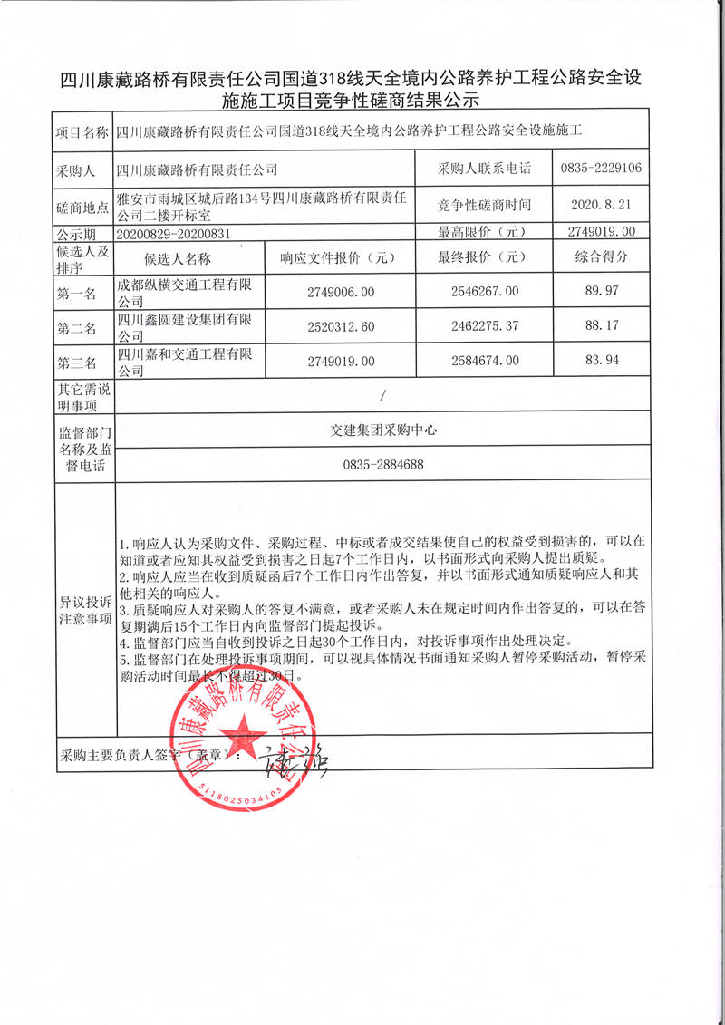 四川康藏路橋有限責(zé)任公司國道318線天全境內(nèi)公路養(yǎng)護(hù)工程公路安全設(shè)施施工項(xiàng)目競爭性磋商結(jié)果公示