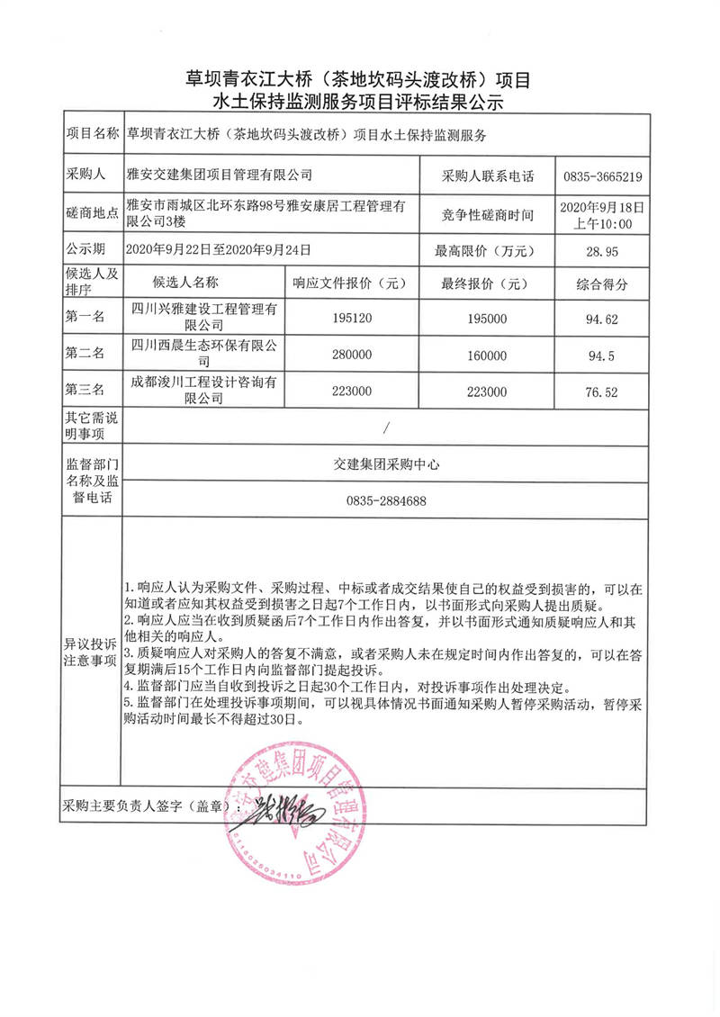 雅安交建集團(tuán)項目管理有限公司草壩青衣江大橋(茶地坎碼頭渡改橋)項目水土保持監(jiān)測服務(wù)項目評標(biāo)結(jié)果公示