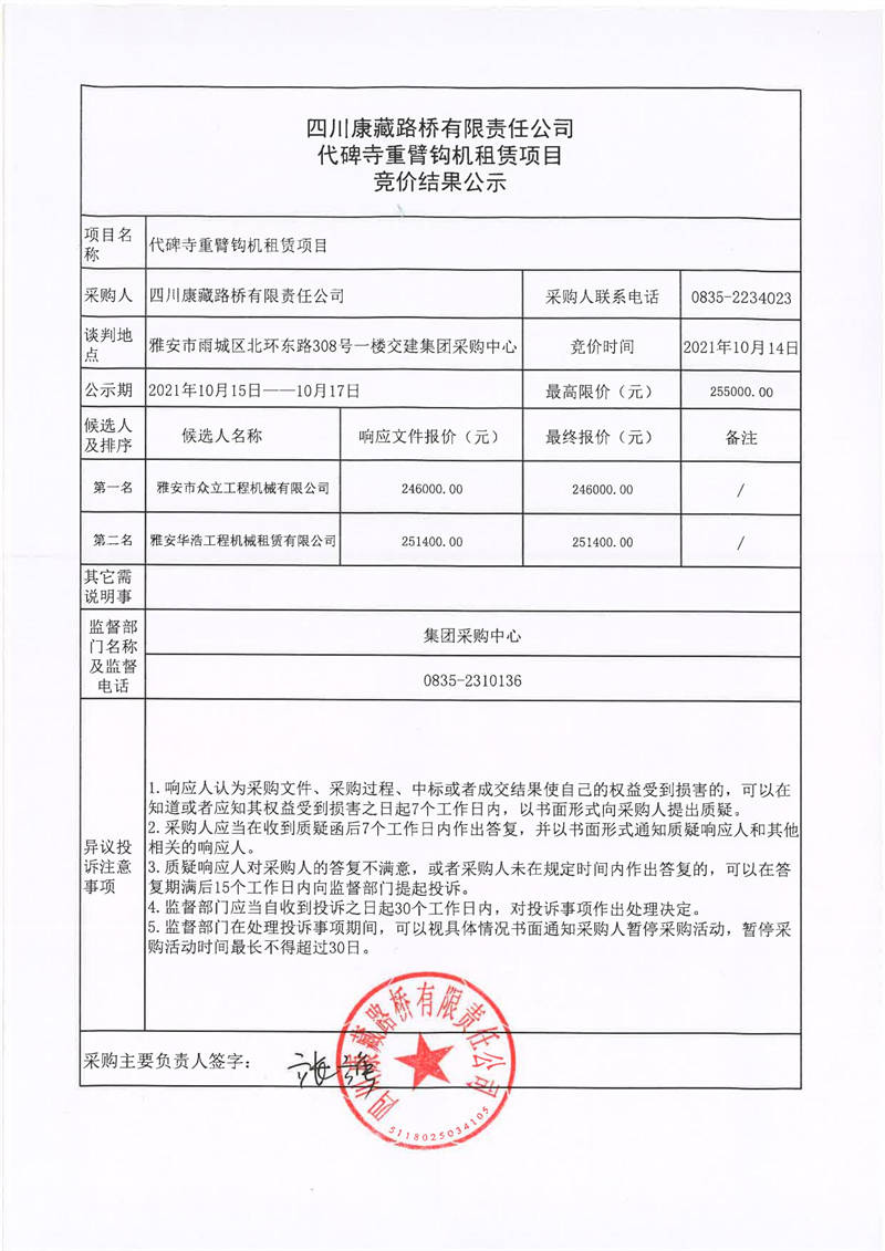 四川康藏路橋有限責(zé)任公司代碑寺重臂鉤機(jī)租賃項目競價結(jié)果公示
