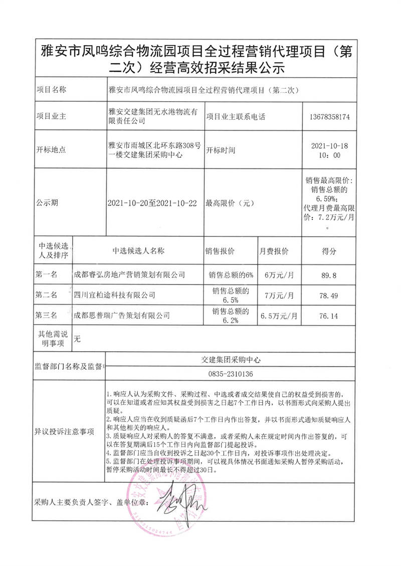 雅安交建集團無水港物流有限責任公司雅安市鳳鳴綜合物流園項目全過程營銷代理項目(第二次)經營高效招采結果公示