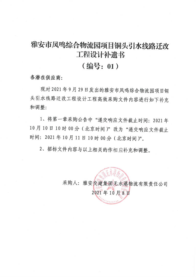 雅安交建集團無水港物流有限責任公司雅安市鳳鳴綜合物流園項目銅頭引水線路遷改工程設計補遺書