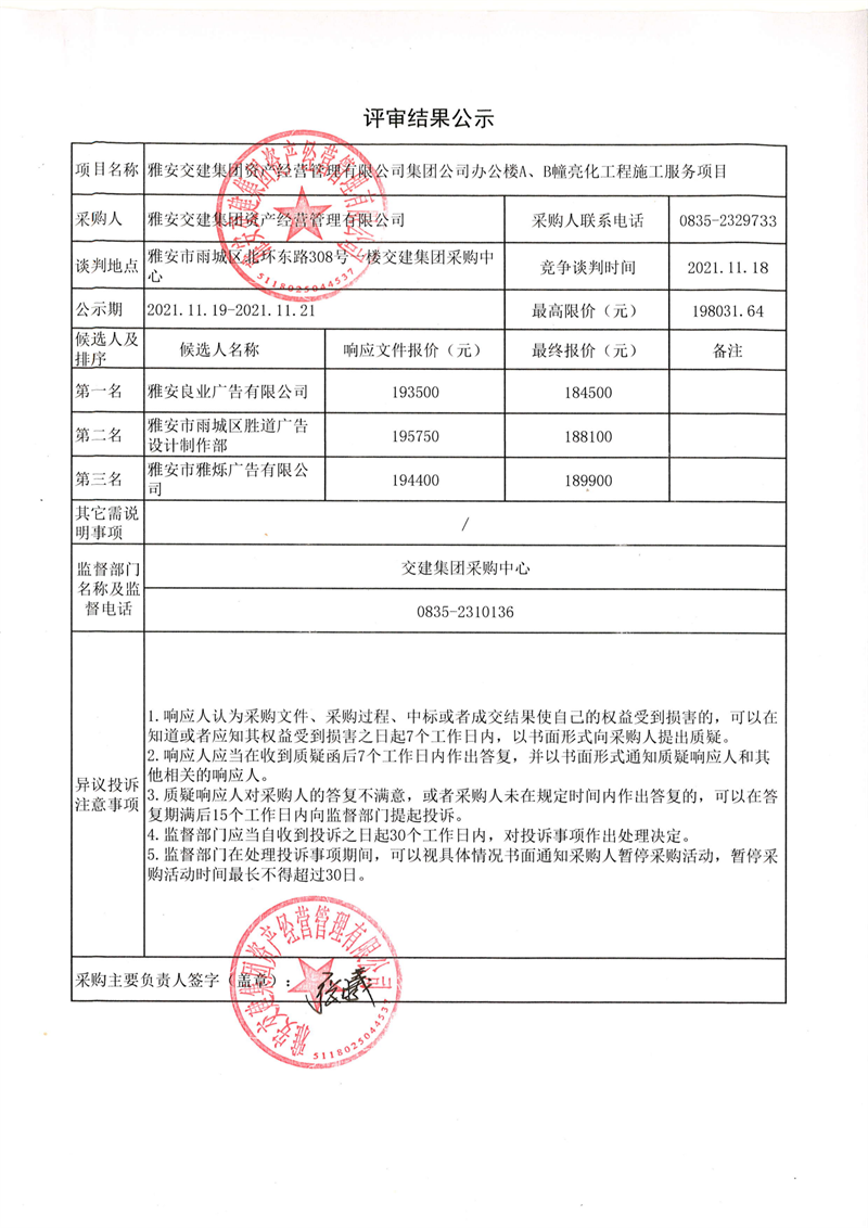 雅安交建集團(tuán)資產(chǎn)經(jīng)營管理有限公司集團(tuán)公司辦公樓A、B幢亮化工程施工服務(wù)項(xiàng)目評審結(jié)果公示