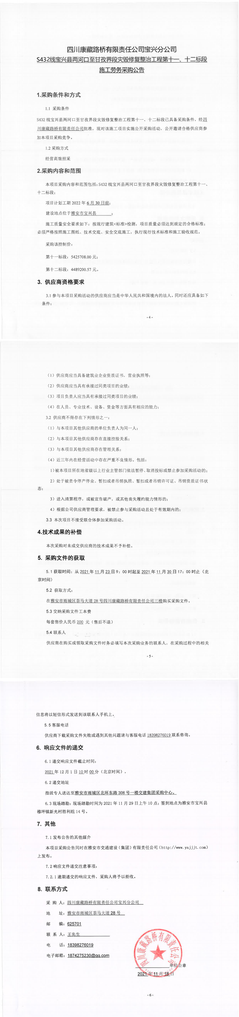 四川康藏路橋有限責(zé)任公司寶興分公司S432線寶興縣兩河口至甘孜界段災(zāi)毀修復(fù)整治工程第十一、十二標(biāo)段施工勞務(wù)采購(gòu)公告