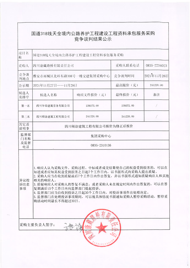 四川康藏路橋有限責(zé)任公司國(guó)道318線(xiàn)天全境內(nèi)公路養(yǎng)護(hù)工程建設(shè)工程資料承包服務(wù)采購(gòu)競(jìng)爭(zhēng)談判結(jié)果公示