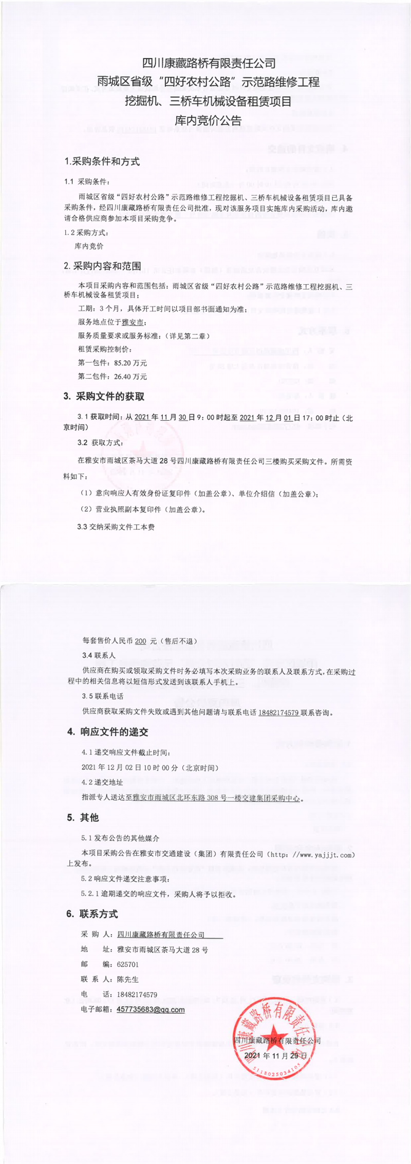 四川康藏路橋有限責(zé)任公司雨城區(qū)省級“四好農(nóng)村公路”示范路維修工程挖掘機(jī)、三橋車機(jī)械設(shè)備租賃項(xiàng)目庫內(nèi)競價公告