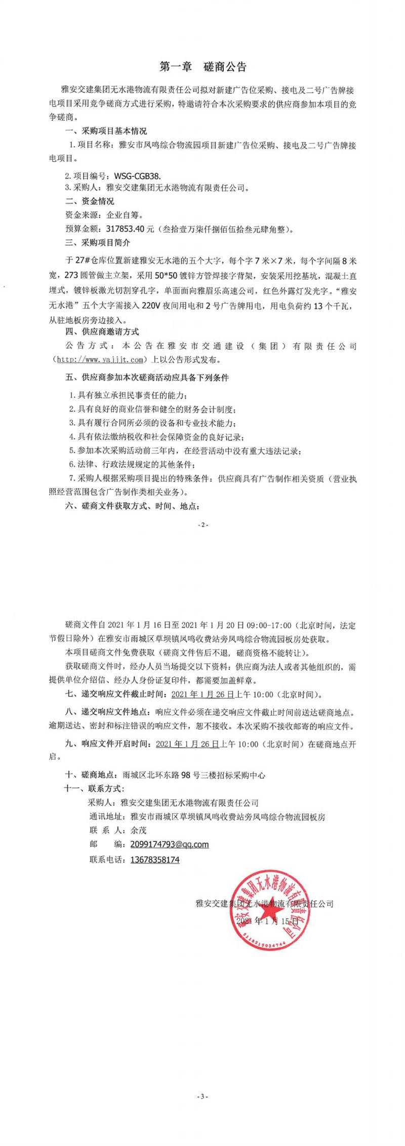 雅安交建集團無水港物流有限責任公司雅安市鳳鳴綜合物流園項目新建廣告位采購、接電及二號廣告牌接電項目磋商公告