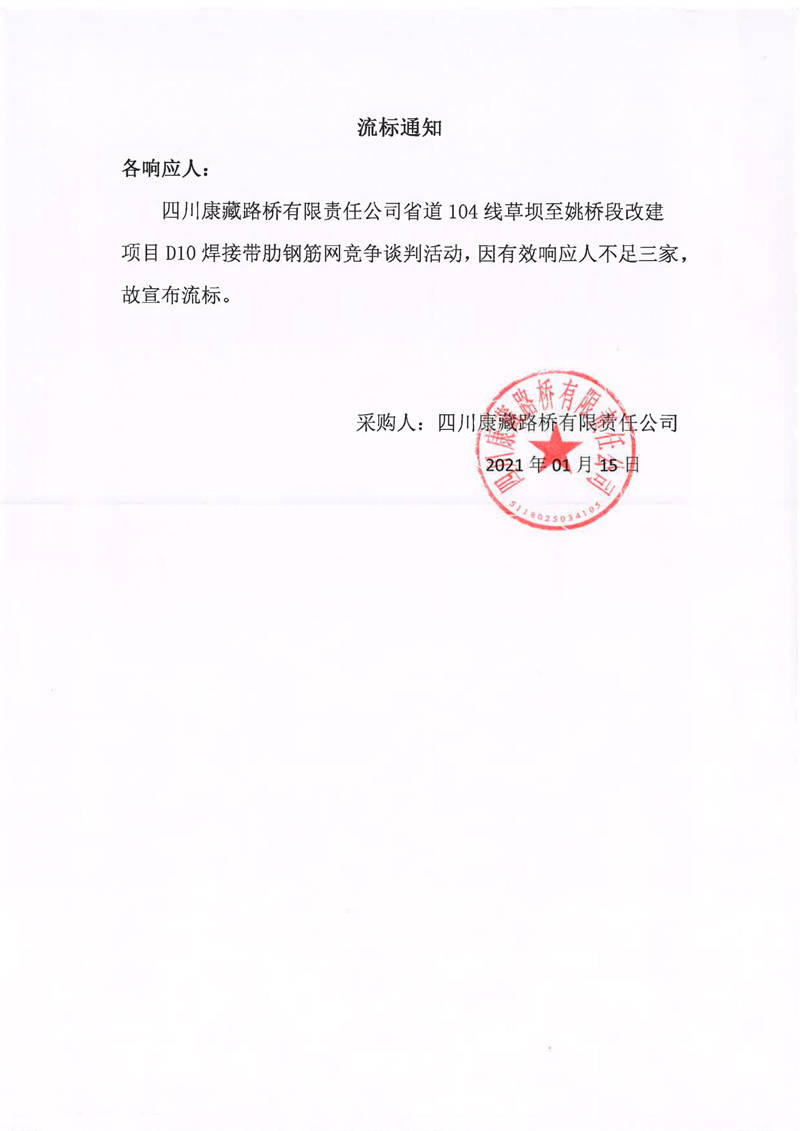 四川康藏路橋有限責(zé)任公司省道104線草壩至姚橋段改建項(xiàng)目D10焊接帶肋鋼筋網(wǎng)采購項(xiàng)目流標(biāo)通知