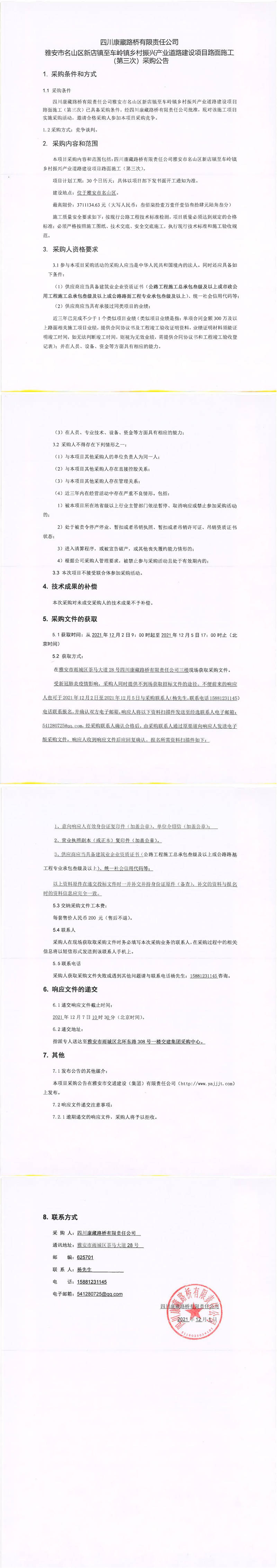 四川康藏路橋有限責(zé)任公司雅安市名山區(qū)新店鎮(zhèn)至車(chē)嶺鎮(zhèn)鄉(xiāng)村振興產(chǎn)業(yè)道路建設(shè)項(xiàng)目路面施工(第三次)采購(gòu)公告