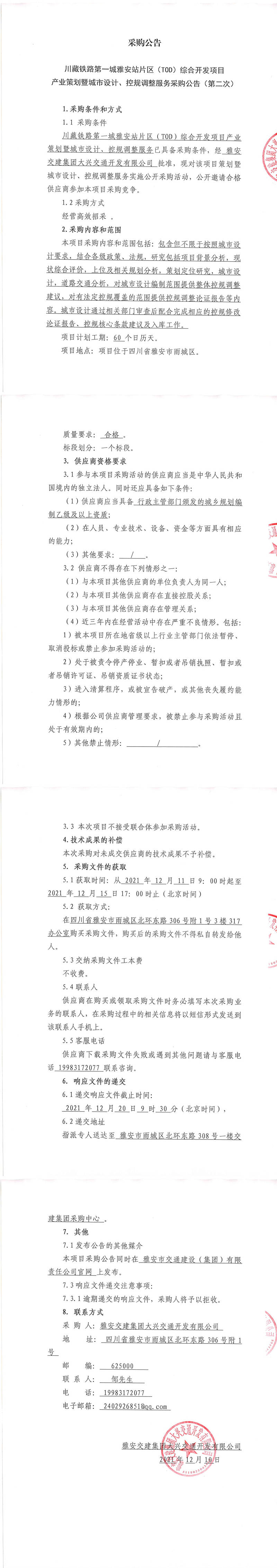 雅安交建集團(tuán)大興交通開發(fā)有限公司川藏鐵路第一城雅安站片區(qū)(TOD)綜合開發(fā)項目產(chǎn)業(yè)策劃暨城市設(shè)計、控規(guī)調(diào)整服務(wù)采購公告(第二次)