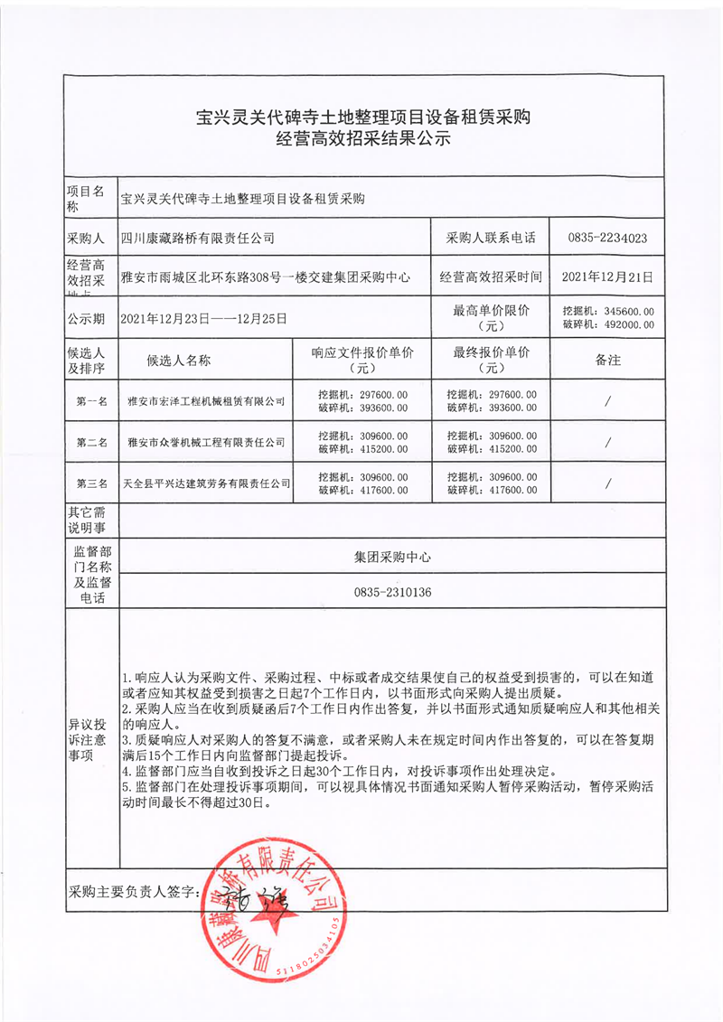 四川康藏路橋有限責(zé)任公司寶興靈關(guān)代碑寺土地整理項(xiàng)目設(shè)備租賃采購(gòu)經(jīng)營(yíng)高效招采結(jié)果公示