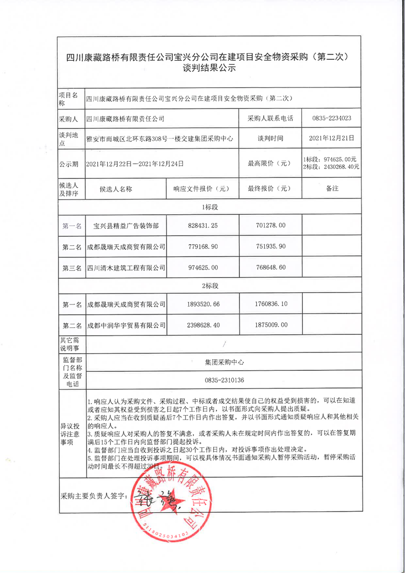 四川康藏路橋有限責任公司寶興分公司在建項目安全物資采購(第二次)談判結果公示