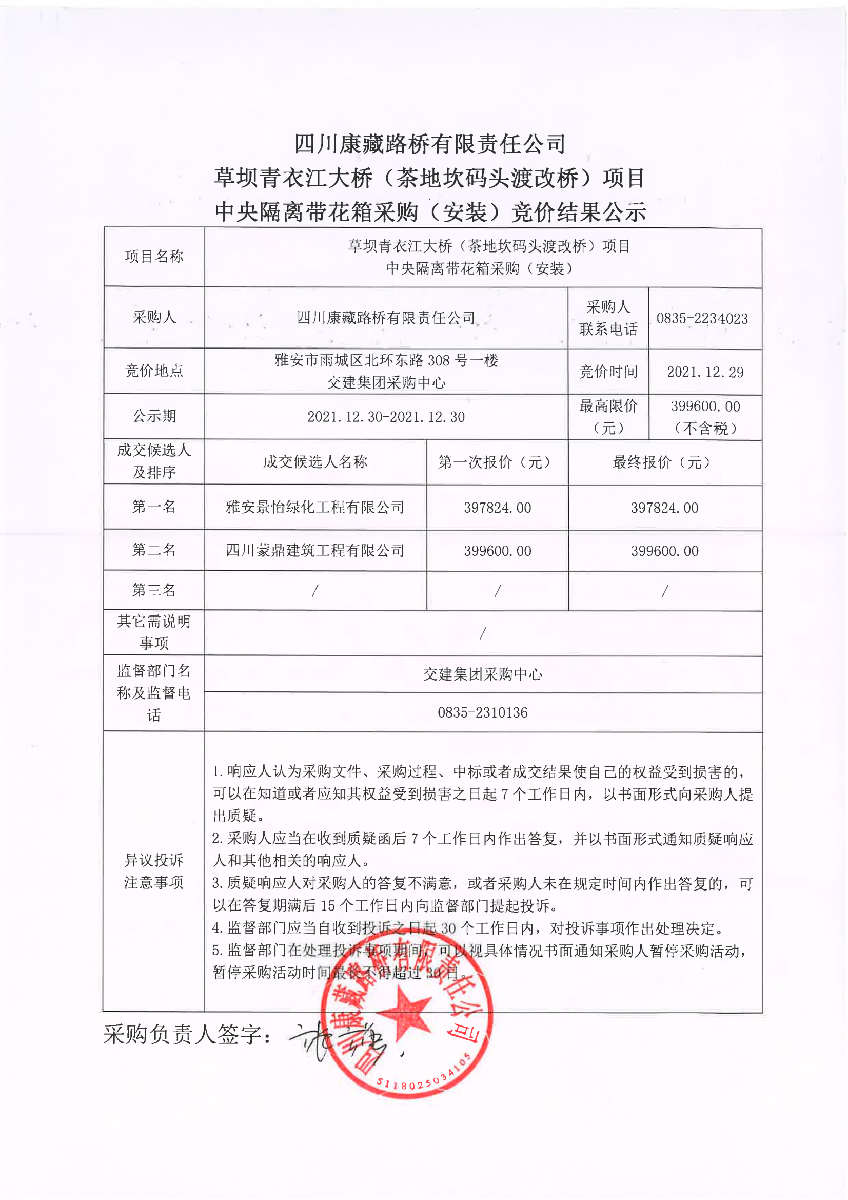四川康藏路橋有限責(zé)任公司草壩青衣江大橋(茶地坎碼頭渡改橋)項(xiàng)目中央隔離帶花箱采購(gòu)(安裝)競(jìng)價(jià)結(jié)果公示