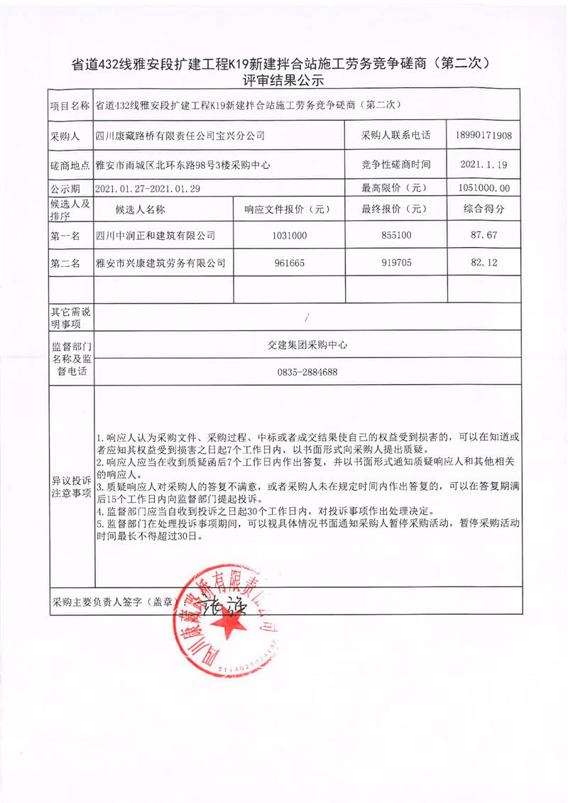 四川康藏路橋有限責(zé)任公司寶興分公司省道432線雅安段擴(kuò)建工程K19新建拌合站施工勞務(wù)競(jìng)爭(zhēng)磋商(第二次)評(píng)審結(jié)果公示
