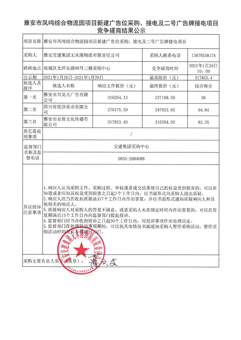 雅安交建集團無水港物流有限責任公司雅安市鳳鳴綜合物流園項目新建廣告位采購、接電及二號廣告牌接電項目競爭磋商結果公示