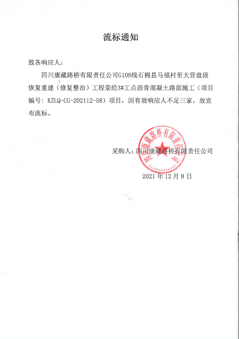 四川康藏路橋有限責(zé)任公司G108線(xiàn)石棉縣馬福村至大營(yíng)盤(pán)段恢復(fù)重建(修復(fù)整治)工程滎經(jīng)3#工點(diǎn)瀝青混凝土路面施工流標(biāo)通知