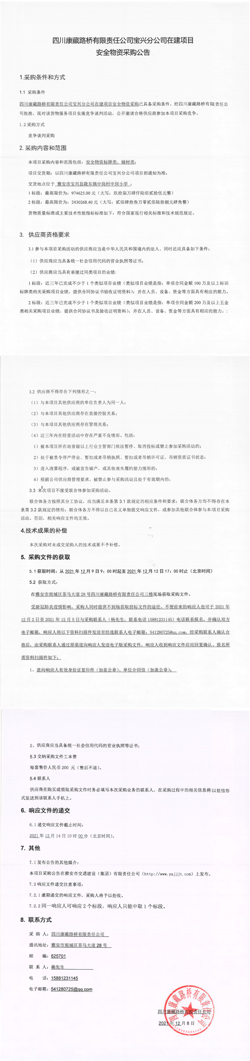 四川康藏路橋有限責(zé)任公司寶興分公司在建項(xiàng)目安全物資采購
