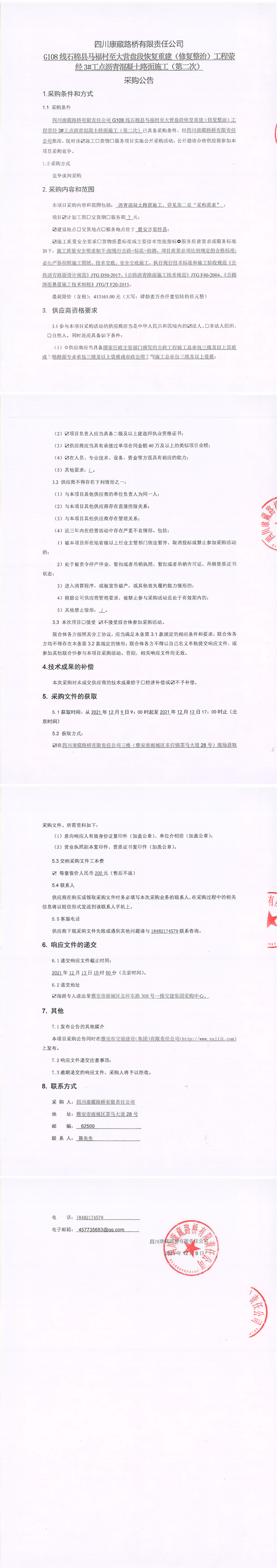 四川康藏路橋有限責任公司G108線石棉縣馬福村至大營盤段恢復重建(修復整治)工程滎經(jīng)3#工點瀝青混凝土路面施工(第二次)采購公告