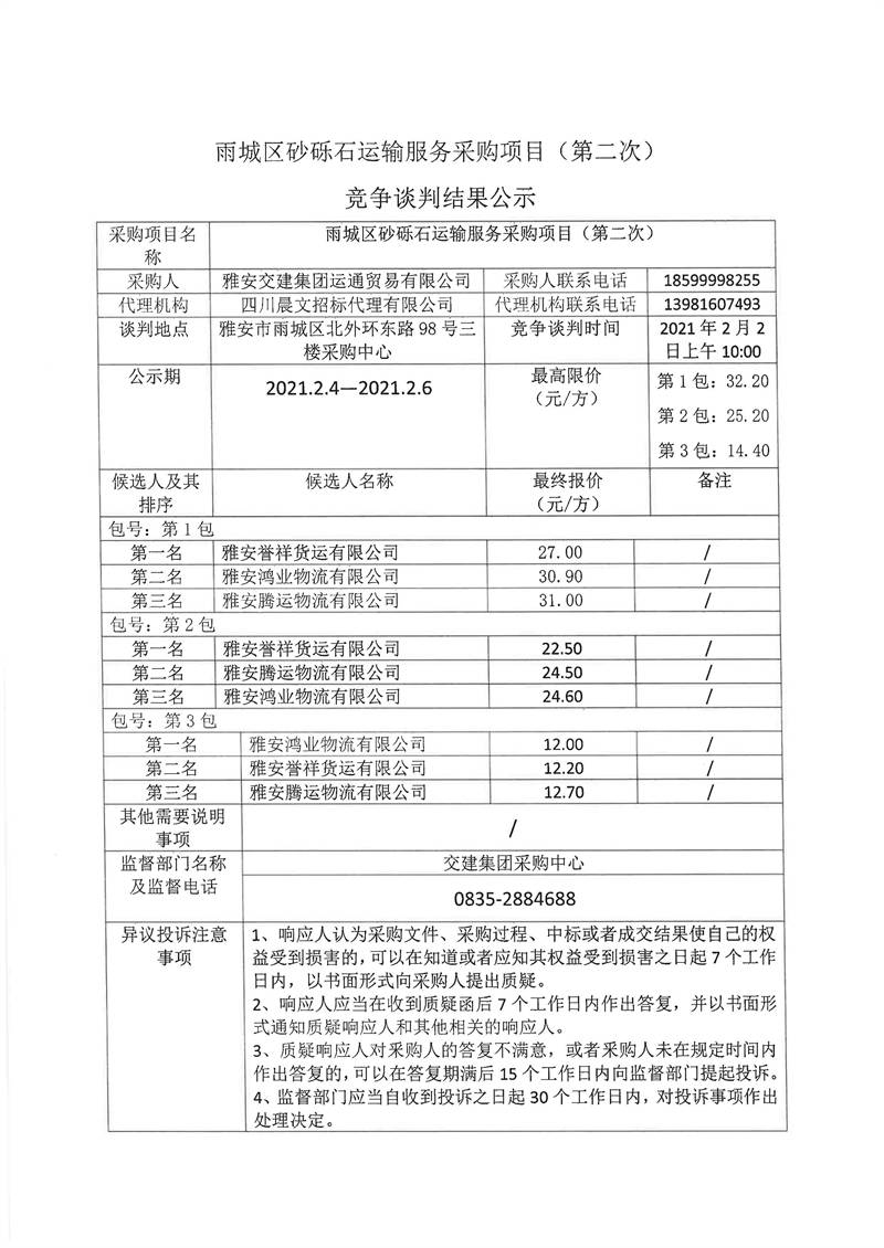 雅安交建集團(tuán)運通貿(mào)易有限公司雨城區(qū)砂礫石運輸服務(wù)采購項目(第二次)競爭談判結(jié)果公示