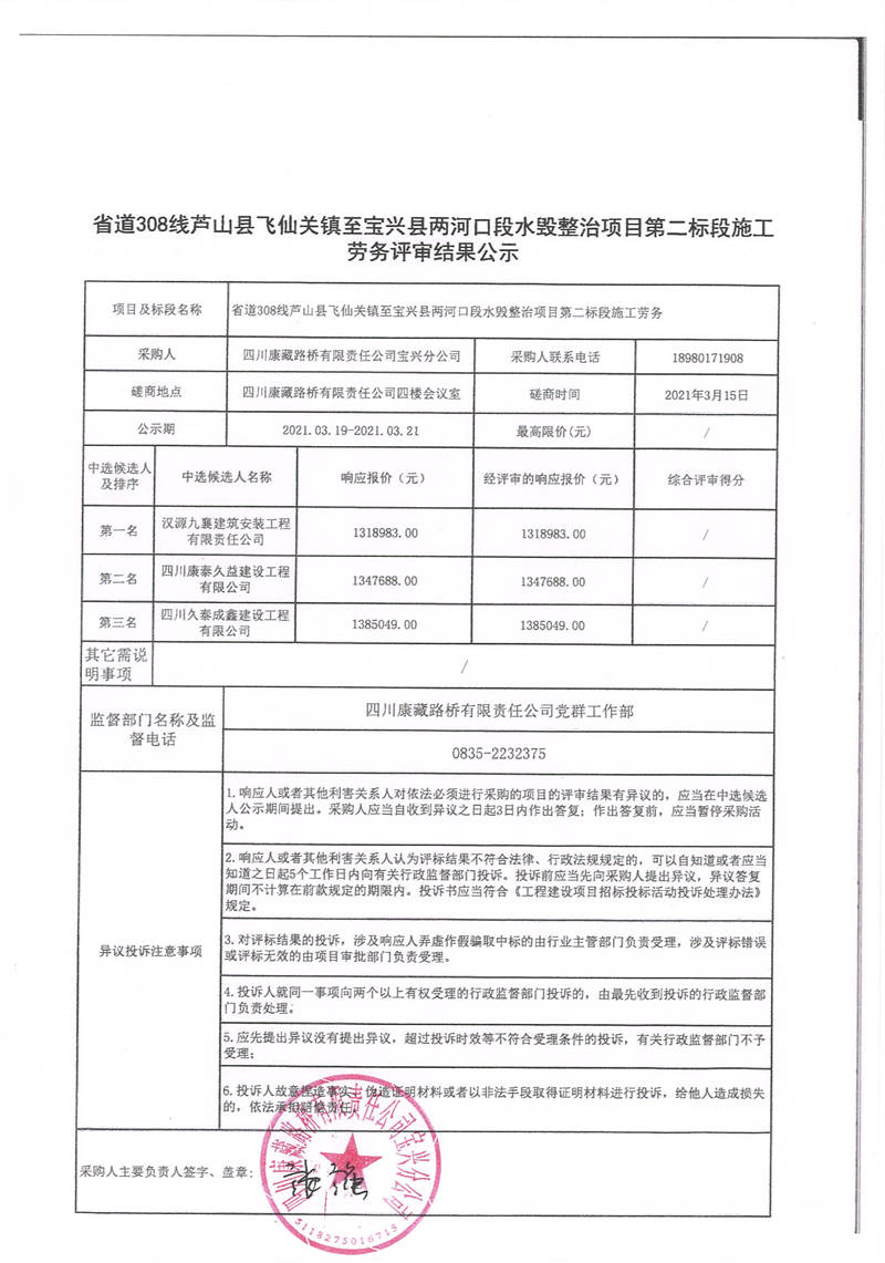四川康藏路橋有限責(zé)任公司寶興分公司省道308線蘆山縣飛仙關(guān)鎮(zhèn)至寶興縣兩河口段水毀整治項(xiàng)目第二標(biāo)段施工勞務(wù)評審結(jié)果公示