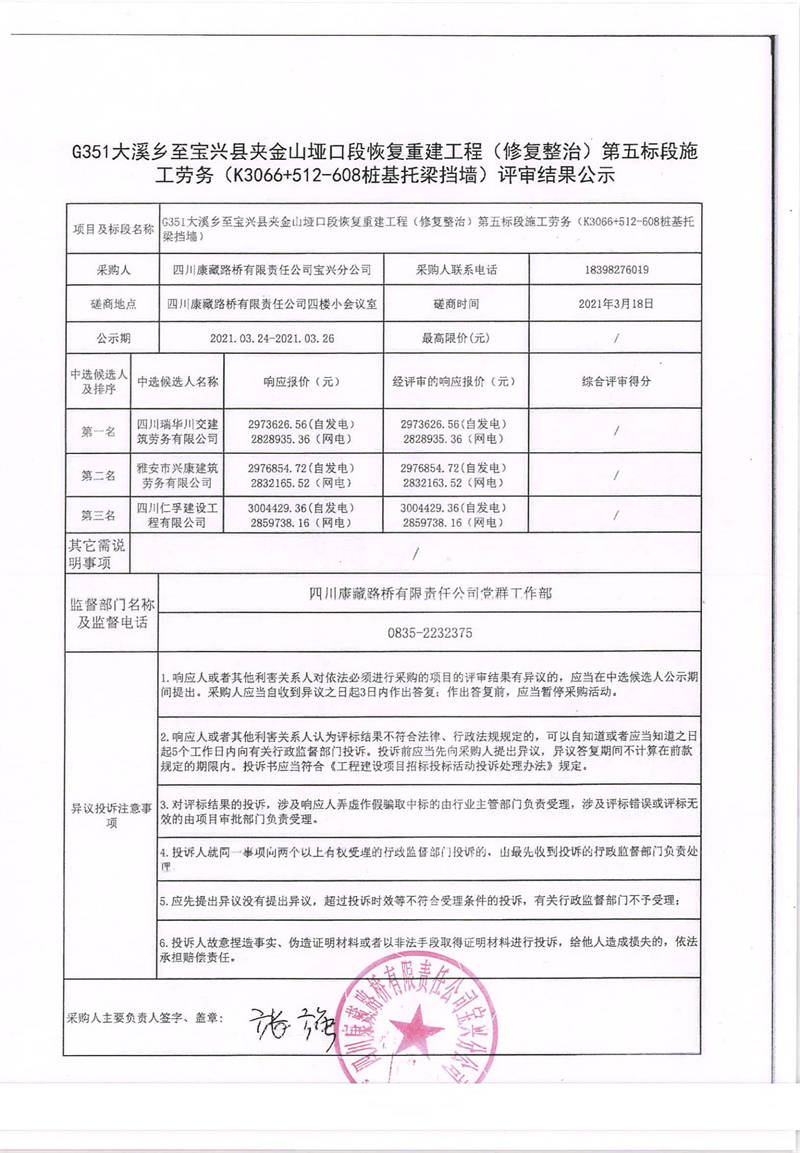 四川康藏路橋有限責(zé)任公司寶興分公司G351大溪鄉(xiāng)至寶興縣夾金山埡口段恢復(fù)重建工程(修復(fù)整治)第五標段施工勞務(wù)(k3066+512-608樁基托梁擋墻)評審結(jié)果公示