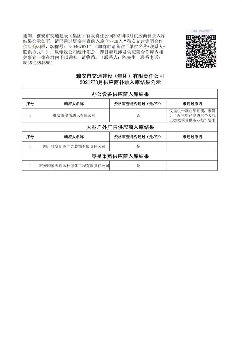 雅安市交通建設(shè)(集團(tuán))有限責(zé)任公司2021年3月供應(yīng)商補(bǔ)錄入庫(kù)結(jié)果公示