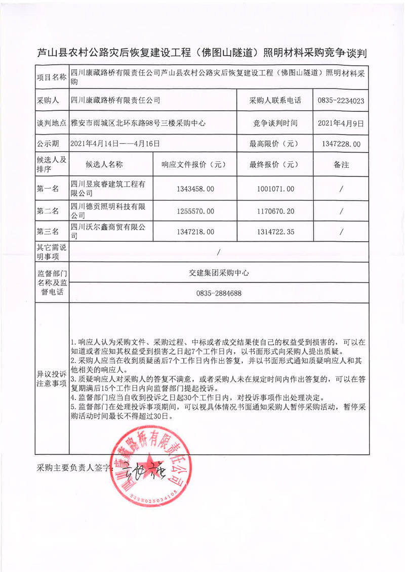 四川康藏路橋有限責(zé)任公司蘆山縣農(nóng)村公路災(zāi)后恢復(fù)建設(shè)工程(佛圖山隧道)照明材料采購競(jìng)爭談判結(jié)果公示