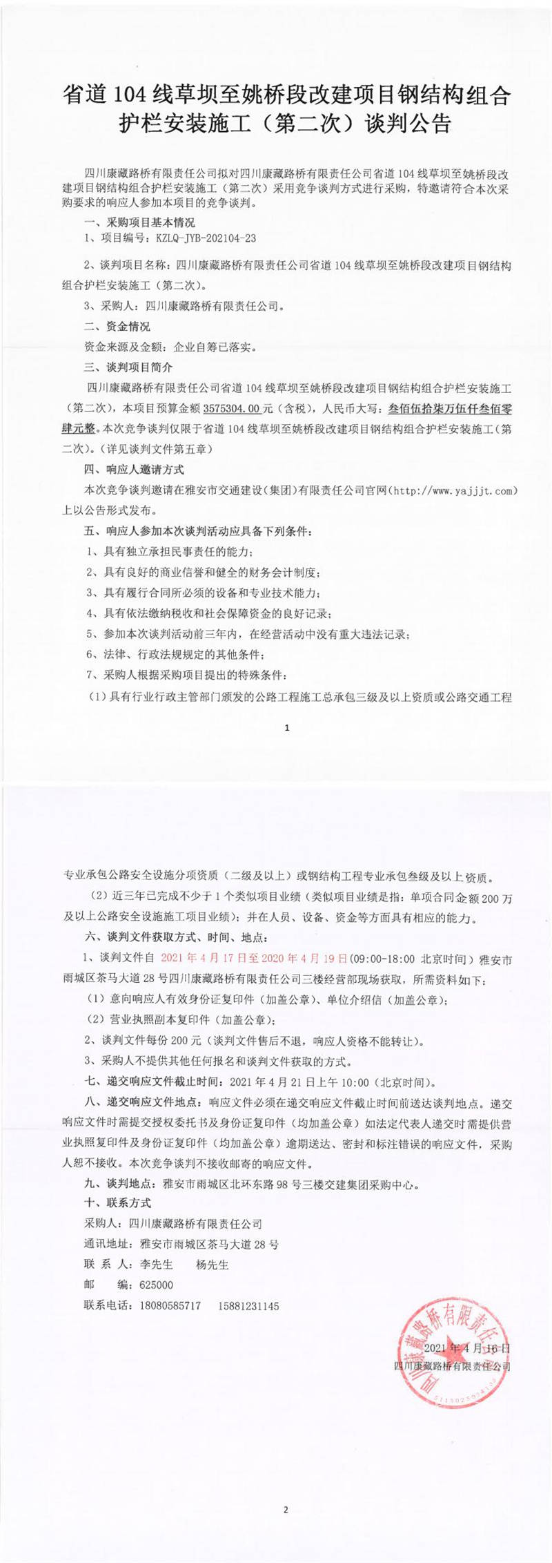 四川康藏路橋有限責(zé)任公司省道104線草壩至姚橋段改建項(xiàng)目鋼結(jié)構(gòu)組合護(hù)欄安裝施工(第二次)談判公告