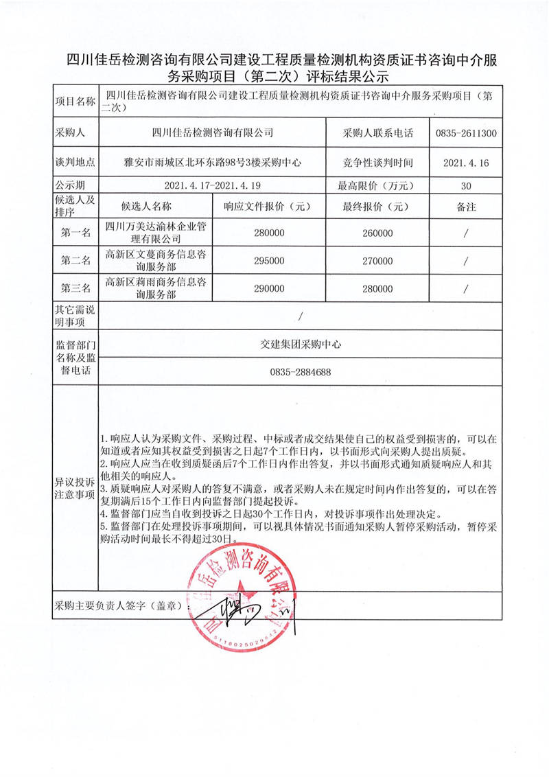 四川佳岳檢測咨詢有限公司建設工程質(zhì)量檢測機構資質(zhì)證書咨詢中介服務采購項目(第二次)評標結果公示