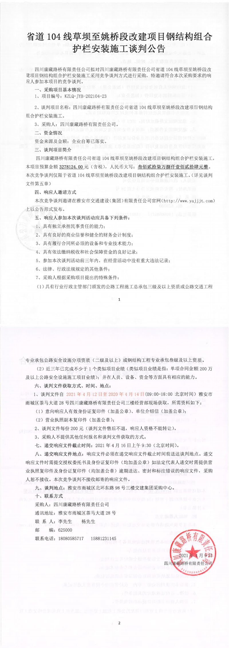 四川康藏路橋有限責(zé)任公司省道104線草壩至姚橋段改建項(xiàng)目鋼結(jié)構(gòu)組合護(hù)欄安裝施工談判公告