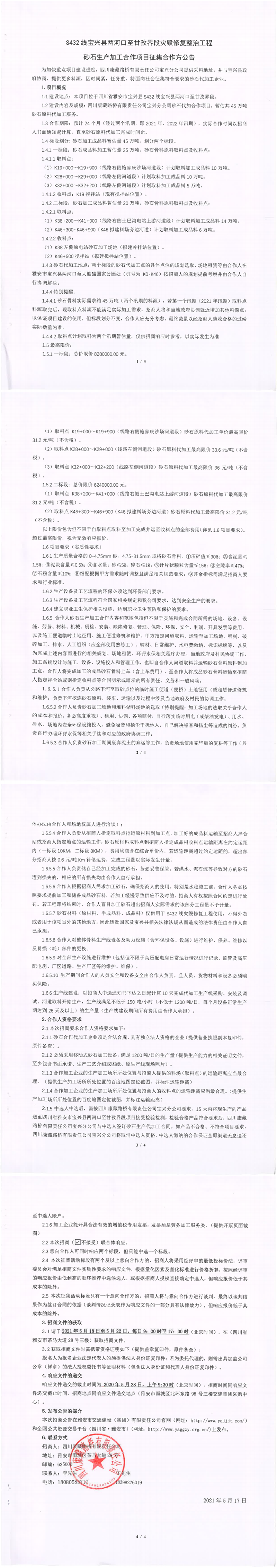 四川康藏路橋有限責(zé)任公司S432線寶興縣兩河口至甘孜界段災(zāi)毀修復(fù)整治工程砂石生產(chǎn)加工合作項(xiàng)目征集合作方公告