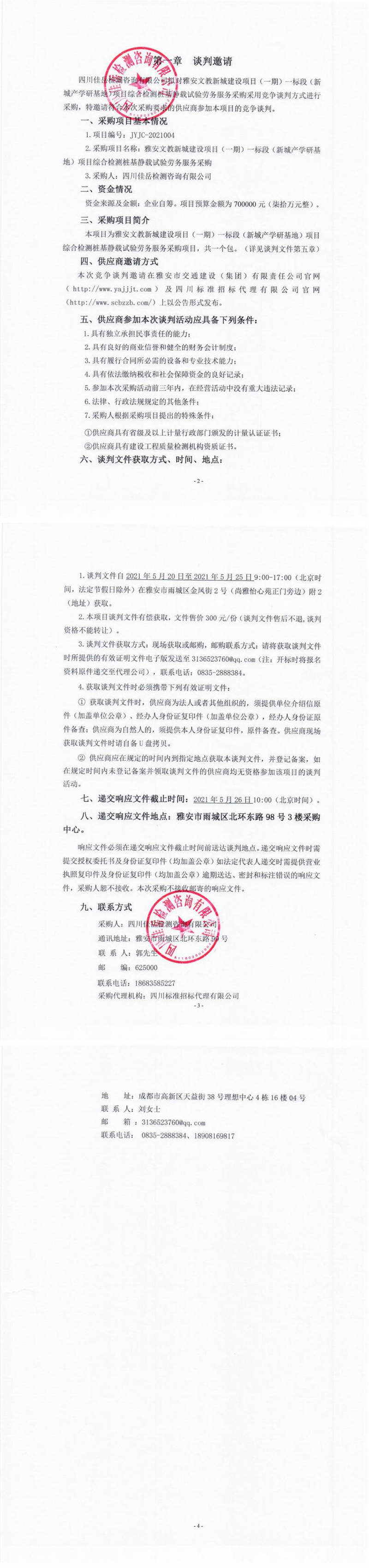 四川佳岳檢測(cè)咨詢(xún)有限公司雅安文教新城建設(shè)項(xiàng)目(一期)一標(biāo)段(新城產(chǎn)學(xué)研基地)項(xiàng)目綜合檢測(cè)樁基靜載試驗(yàn)勞務(wù)服務(wù)競(jìng)爭(zhēng)談判公告