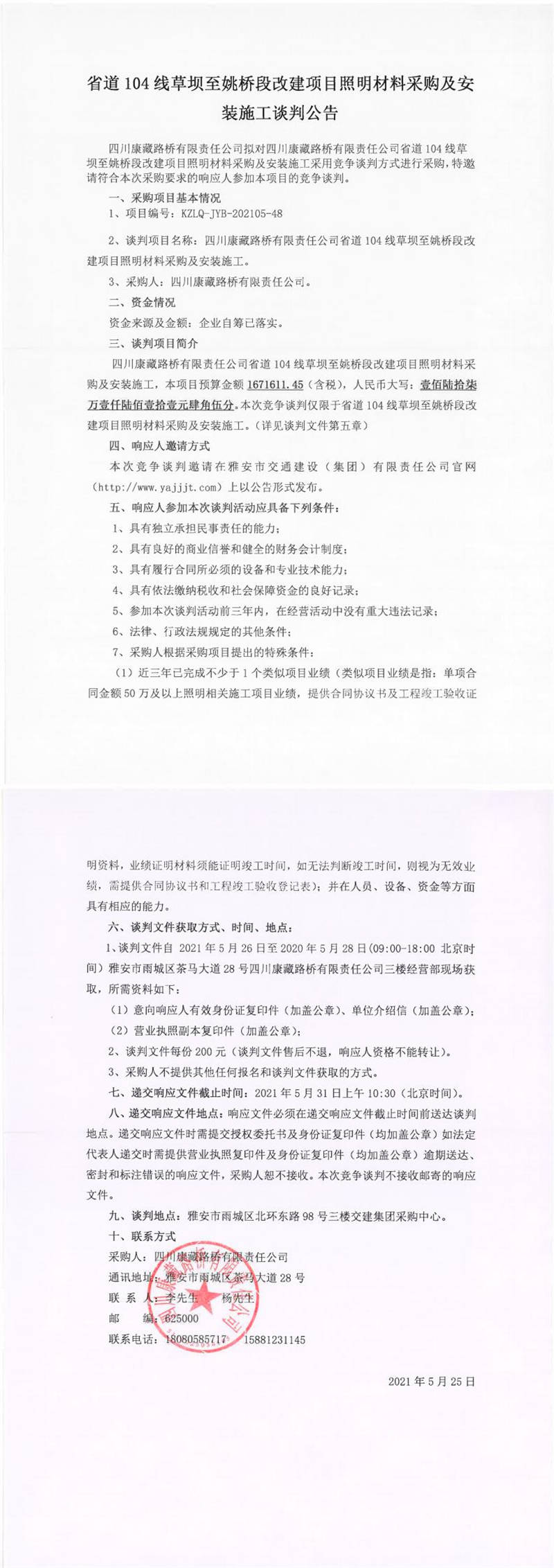 四川康藏路橋有限責(zé)任公司省道104線草壩至姚橋段改建項(xiàng)目照明材料采購及安裝施工談判公告
