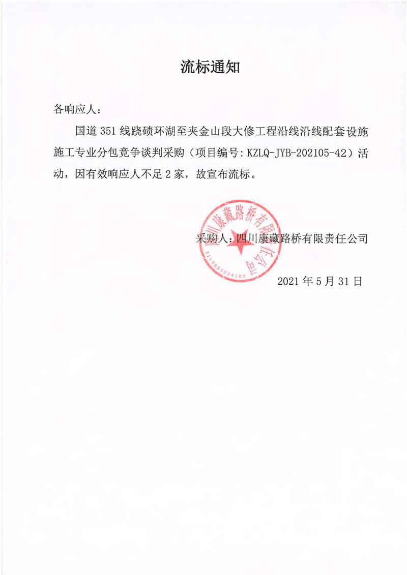 四川康藏路橋有限責(zé)任公司國(guó)道351線蹺磧環(huán)湖至夾金山段大修工程沿線沿線配套設(shè)施施工專業(yè)分包競(jìng)爭(zhēng)談判采購(gòu)流標(biāo)通知