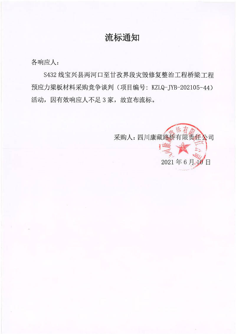 四川康藏路橋有限責(zé)任公司S432線寶興縣兩河口至甘孜界段災(zāi)毀修復(fù)整治工程橋梁工程預(yù)應(yīng)力梁板材料采購競(jìng)爭(zhēng)談判流標(biāo)通知