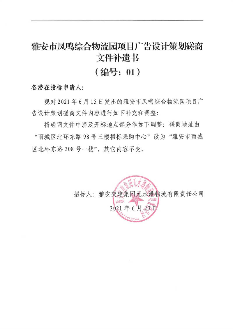 雅安交建集團無水港物流有限責任公司雅安市鳳鳴綜合物流園項目廣告設(shè)計策劃磋商文件補遺書