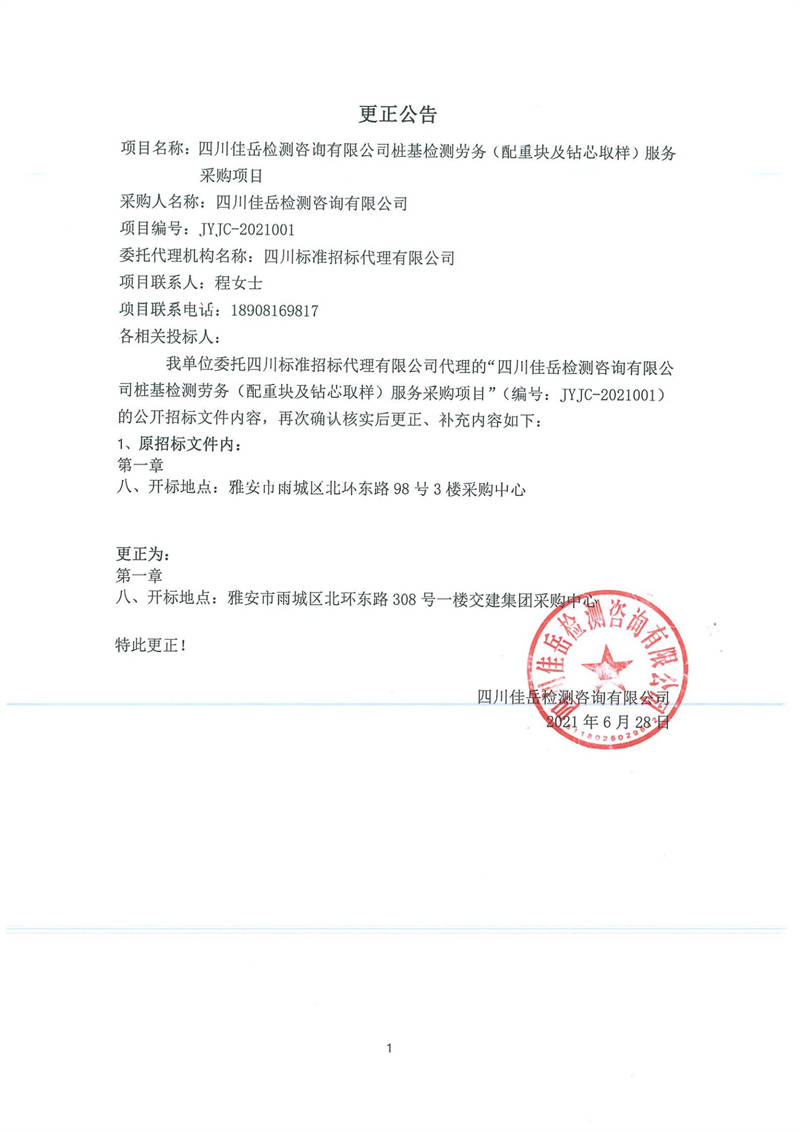 四川佳岳檢測(cè)咨詢有限公司樁基檢測(cè)勞務(wù)(配重塊及鉆芯取樣)服務(wù)采購(gòu)項(xiàng)目更正公告