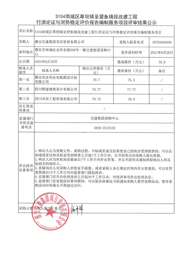 雅安交建集團(tuán)項(xiàng)目管理有限公司S104雨城區(qū)草壩鎮(zhèn)至望魚(yú)鎮(zhèn)段改建工程行洪論證與河勢(shì)穩(wěn)定評(píng)價(jià)報(bào)告編制服務(wù)項(xiàng)目評(píng)審結(jié)果公示