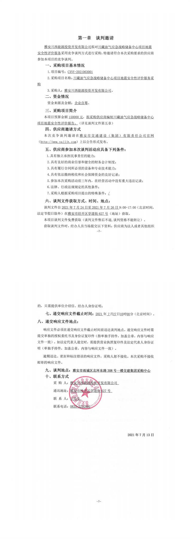 雅安川西能源投資開發(fā)有限公司川藏油氣應(yīng)急戰(zhàn)略儲(chǔ)備中心項(xiàng)目地震安全性評(píng)價(jià)服務(wù)采購(gòu)競(jìng)爭(zhēng)談判公告