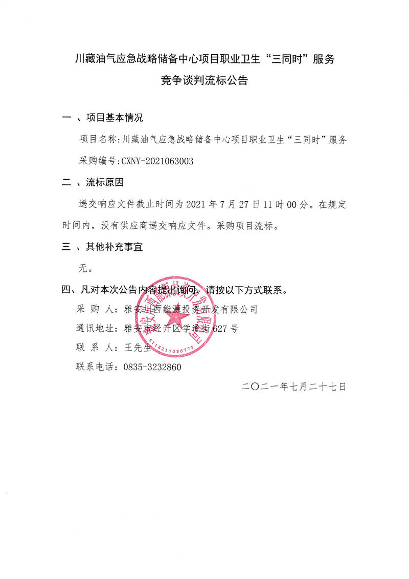 雅安川西能源投資開發(fā)有限公司川藏油氣應(yīng)急戰(zhàn)略儲備中心項(xiàng)目職業(yè)衛(wèi)生“三同時(shí)”服務(wù)競爭談判流標(biāo)公告