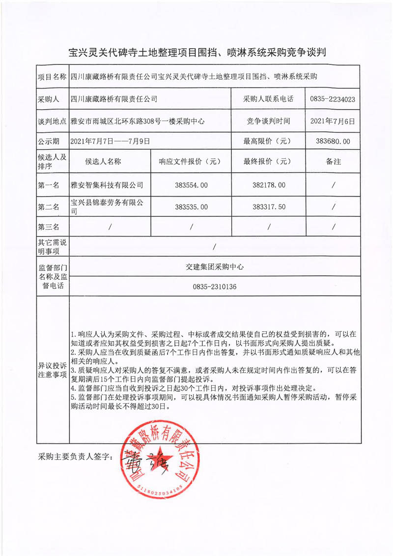 四川康藏路橋有限責任公司寶興靈關代碑寺土地整理工程項目圍擋、噴淋系統(tǒng)采購競爭談判結果公示